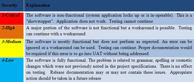Defects found during functional testing are assigned with one of the following four (4) levels of severity: